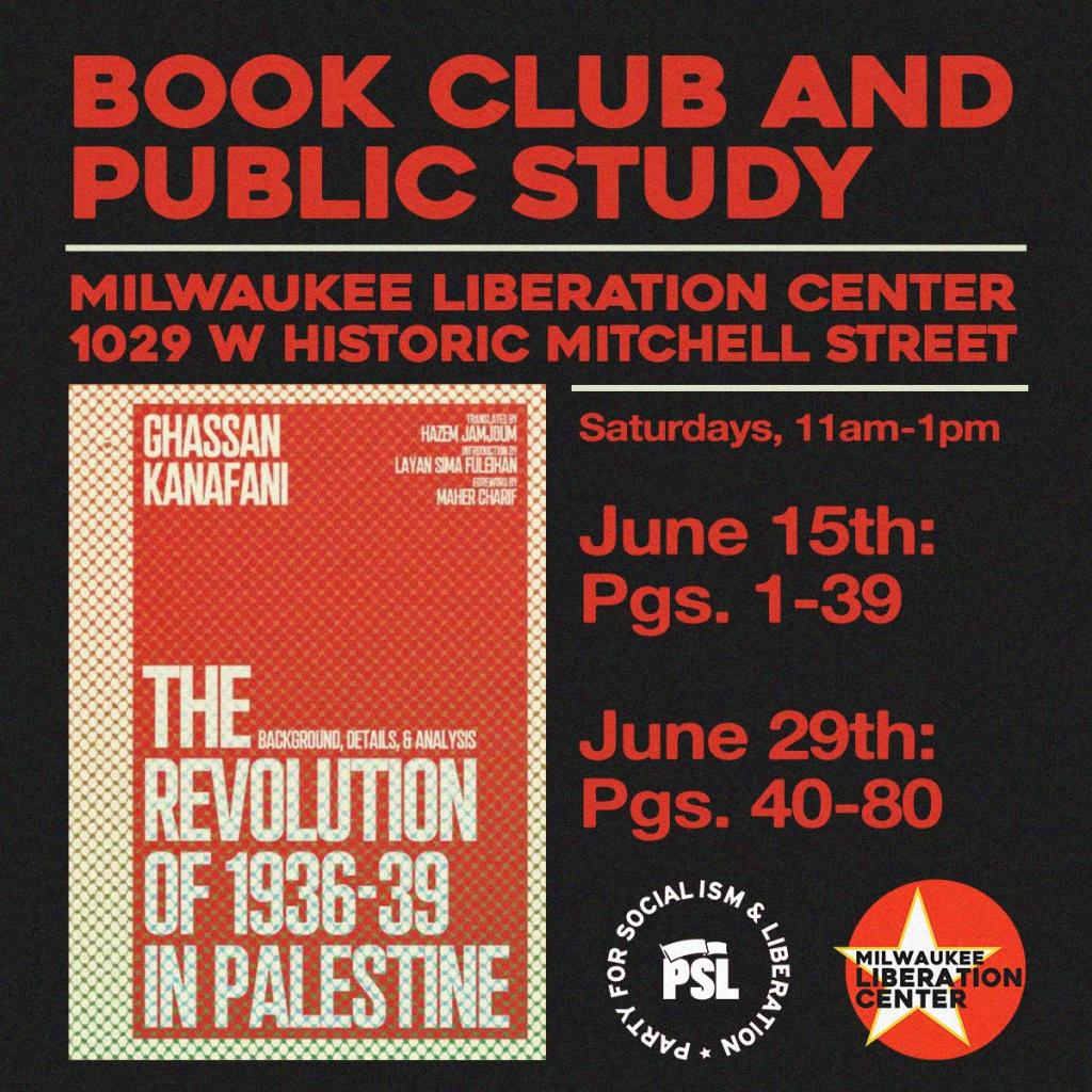 It is impossible to separate Kanafani’s political and literary work. 10 days after Kanafani’s birth, the Palestinian revolution of 1936 erupted all across Palestine lasting until 1939. Join the PSL at the Milwaukee Liberation Center for a two part study of Ghassan Kanafani’s analysis of the 1936-1939 Revolution, a revolution in which his father participated in.